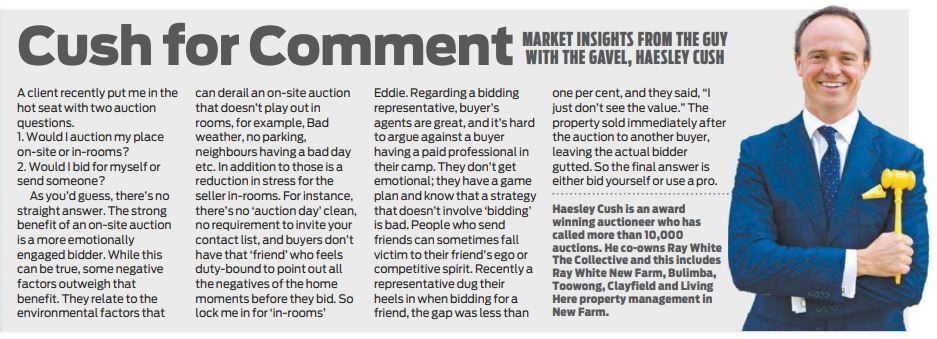People who send friends can sometimes fall victim to their friend’s ego or competitive spirit. Recently a representative dug their heels in when bidding for a friend, the gap was less than one per cent, and they said, “I just don’t see the value.” The property sold immediately after the auction to another buyer, leaving the actual bidder gutted. So the final answer is either bid yourself or use a pro.
