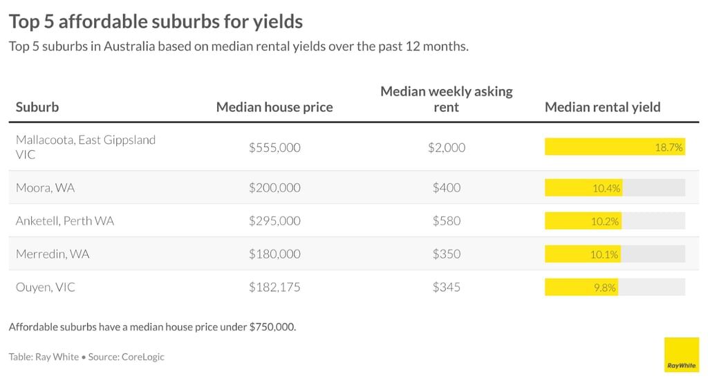Excluding volatile mining towns, there is less of a defined trend. Generally areas with very low incomes have high yields but do not see strong capital growth. Currently, Mallacoota in East Gippsland Victoria tops the nation, recording a median rental yield on house rentals over the past 12 months at 18.7 per cent, likely due to a lack of rental properties in the town.