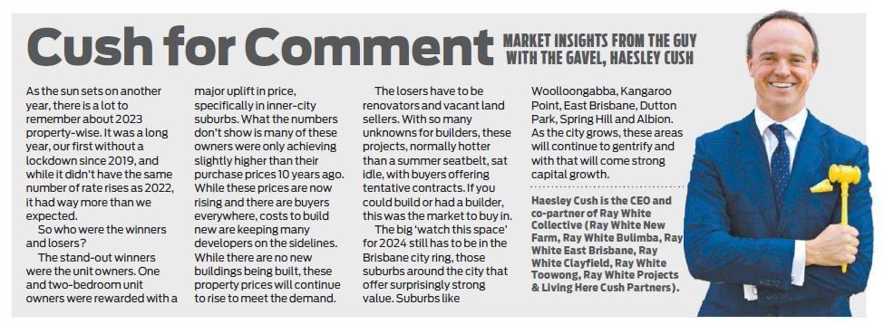 While these prices are now rising and there are buyers everywhere, costs to build new are keeping many developers on the sidelines. While there are no new buildings being built, these property prices will continue to rise to meet the demand. The losers have to be renovators and vacant land sellers. With so many unknowns for builders, these projects, normally hotter than a summer seatbelt, sat idle, with buyers offering tentative contracts. If you could build or had a builder, this was the market to buy in. The big ‘watch this space’ for 2024 still has to be in the Brisbane city ring, those suburbs around the city that offer surprisingly strong value. Suburbs like Woolloongabba, Kangaroo Point, East Brisbane, Dutton Park, Spring Hill and Albion. As the city grows, these areas will continue to gentrify and with that will come strong capital growth.